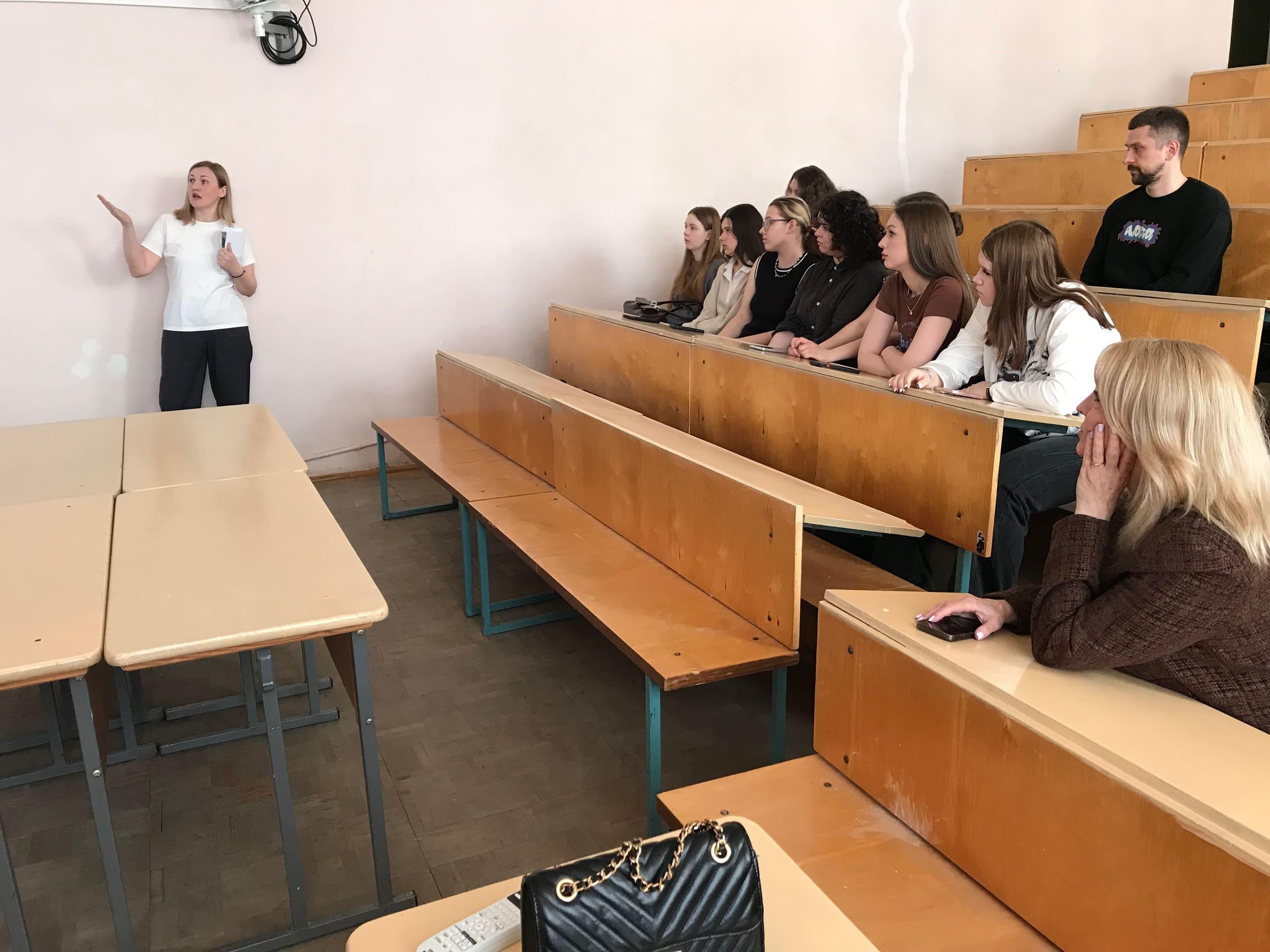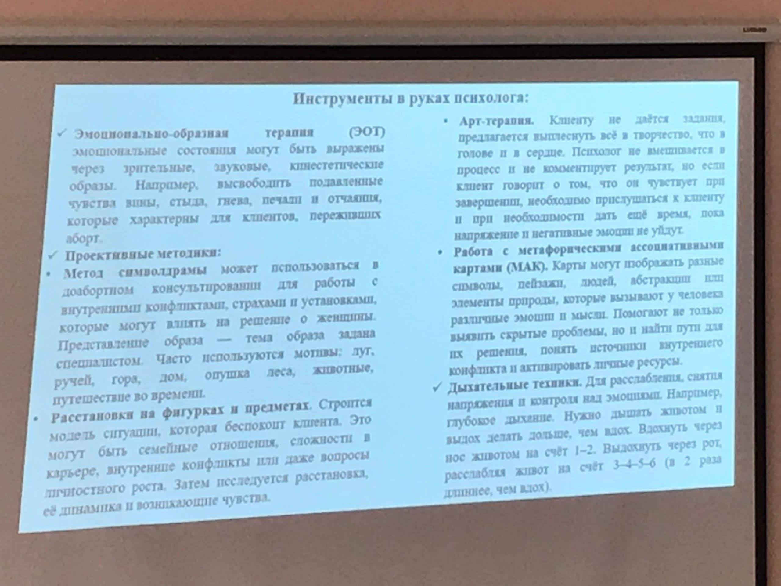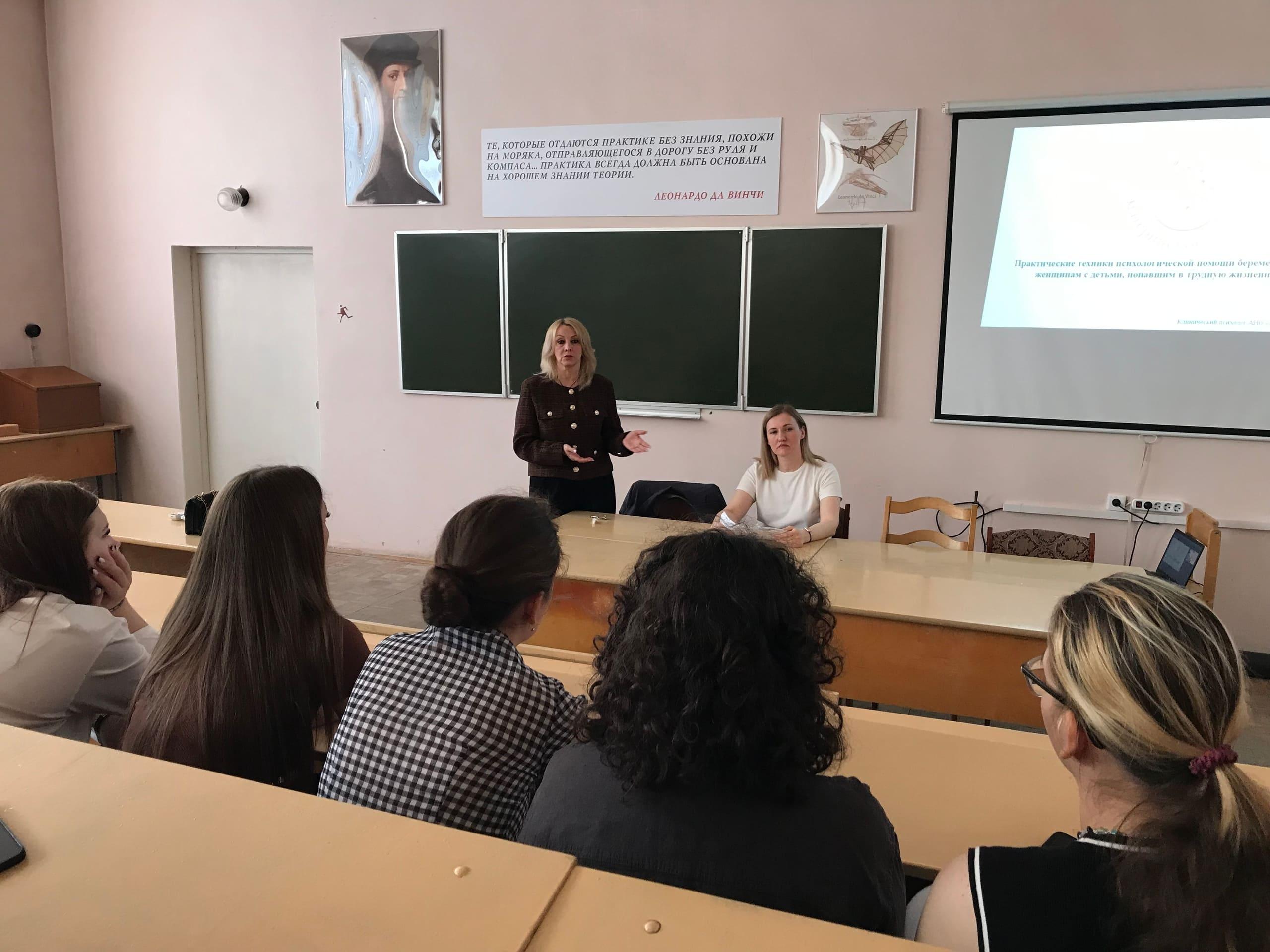 Директор Ольга Михайловна рассказала об основных направлениях работы в деятельности общественной организации и успешном опыте оказания юридической, социальной, психологической помощи беременным женщинам и их семьям. Клинический психолог Виктория Олеговна рассказала о работе психолога в женской консультации по снижению рисков абортов среди беременных женщин. Поделилась со студентами успешным опытом того, как удается в большинстве случаем помочь беременным женщинам посмотреть на ситуацию аборта с другой стороны и сохранить жизнь ребенка, а также улучшить отношения с родственниками в семье. Виктория Олеговна подробно рассмотрела со студентами практические ситуации, кейсы с использованием конкретных психотехник в работе психолога при индивидуальном консультировании беременных женщин. Обратила внимание на важность в работе психолога поддержки коллег и профессиональной супервизии.